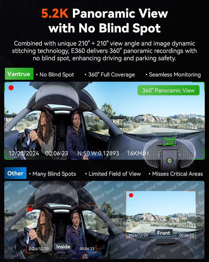 - Front and Cabin: 5.2K 360-degree panoramic recording