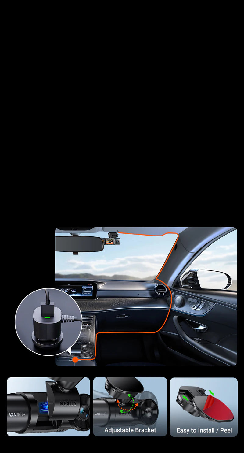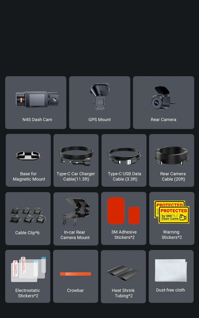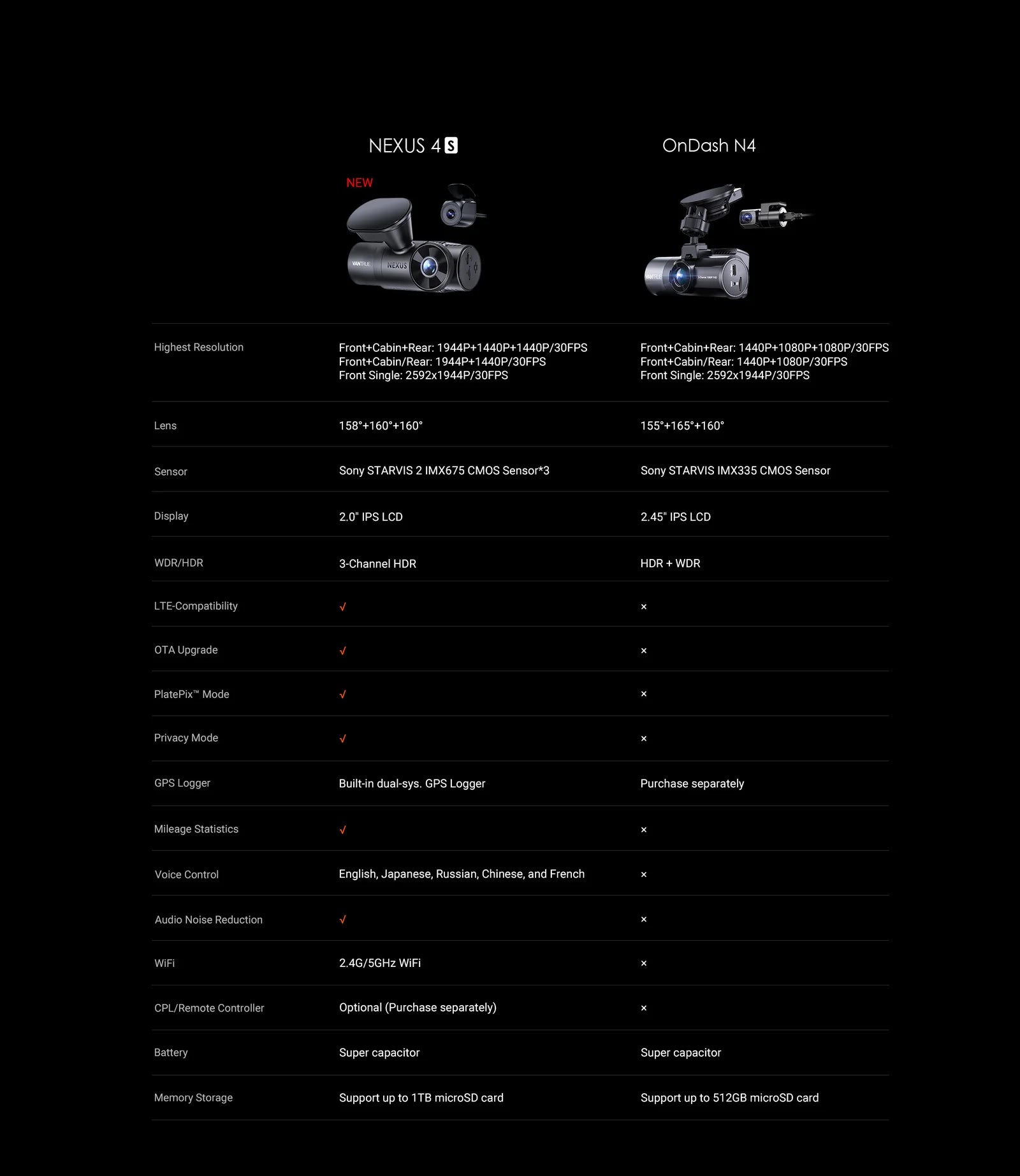 The N4S dash cam offers 3-channel recording in 2.7K front and 2.5K cabin/rear resolutions. Featuring Sony STARVIS 2 sensors and 158° + 160° + 160° wide-angle lenses, it ensures 360° clear coverage, capturing every detail without blind spots.